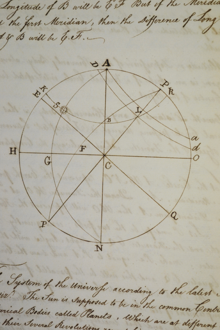 A detail from an 18th-century workbook by Newport teacher William Engs, showing navigational techniques based on observance of the position of particular celestial bodies (sun, planets, etc). From the NHS collection.